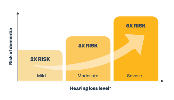 What’s more, with moderate hearing loss, the risk TRIPLES, and with severe hearing loss, the risk FIVE TIMES higher.